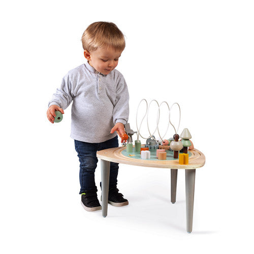 Cette table multi-activités en bois est parfaitement adaptée aux tout-petits ! Bébé va pouvoir toucher à tout et apprendre en s'amusant avec tous ces petits jeux : un rail de train circulaire avec 2 véhicules, 2 arbres à empiler, 3 loopings avec des billes, un moulin et une clochette, 3 engrenages à faire tourner et 5 formes à encastrer. Cette table multi-activités est équipée de pieds anti-dérapants pour plus de stabilité. La hauteur de la table est de 26,5 cm. Ce jouet en bois fait partie de la collection Sweet Cocoon, une gamme aux couleurs délicates, inspirée des tendances actuelles pour accompagner les premiers apprentissages de votre enfant tout en douceur !